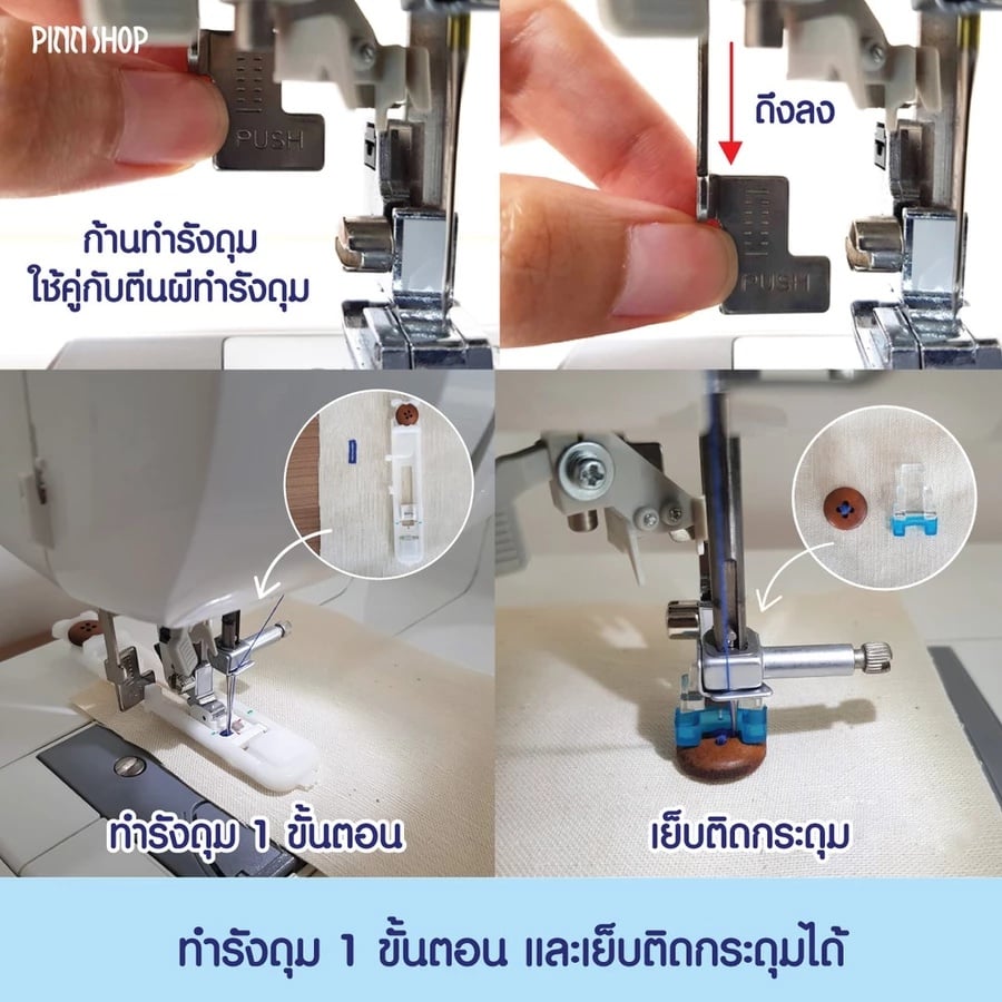 ⁃ มีปุ่มสำหรับการเย็บถอยหลัง (ย้ำตะเข็บ) เพื่อป้องกันด้ายหลุดเวลาเริ่มเย็บและจบการเย็บ