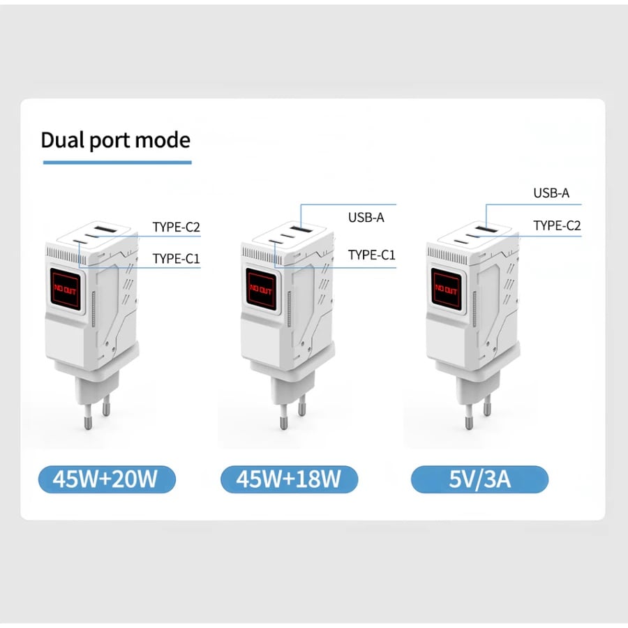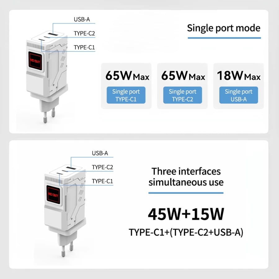 1 + USB-A: 45W + 18W Type-C1 + USB-A: 45W + 18W