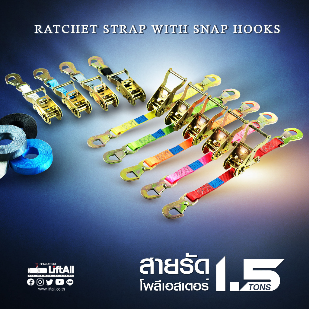 ชื่อ : Ratchet Strap with Snap hooks ชุดสายรัดโพลีเอสเตอร์, รุ่นหัวล็อค 1.5 ton (Wide handle ratchet buckle), ชนิดมีตะขอ-แบบมีล็อค Snap Hook 2 ปลาย