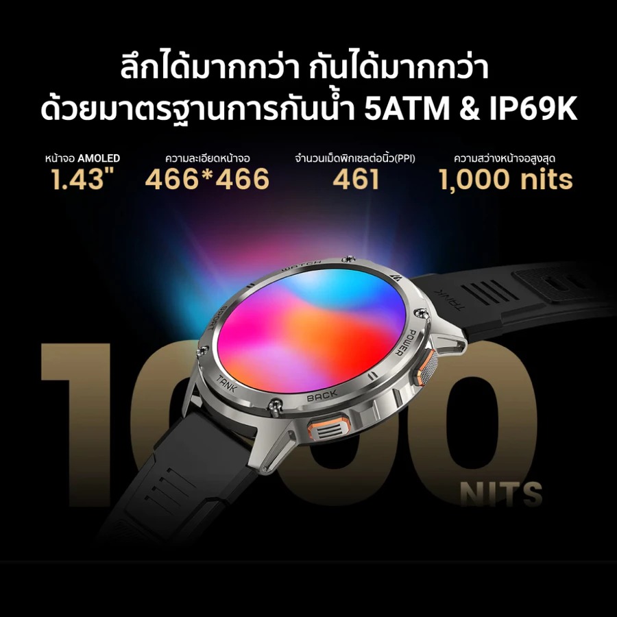 - หน้าจอ AMOLED 1.43 นิ้ว ให้ความละเอียดถึง 466x466p , 461 PPI