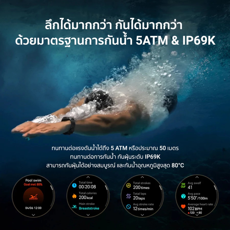 * ทนทานต่อแรงดันน้ำได้ถึง 5 ATM หรือประมาณ 50 เมตร