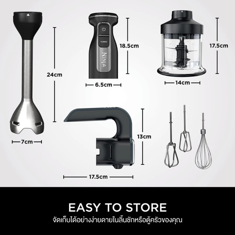 - 9” Immersion blending arm พร้อมใบมีดสแตนเลสและแผ่นป้องกันในตัว