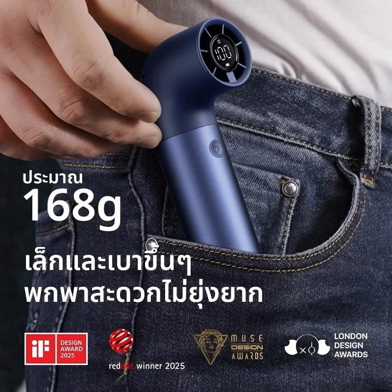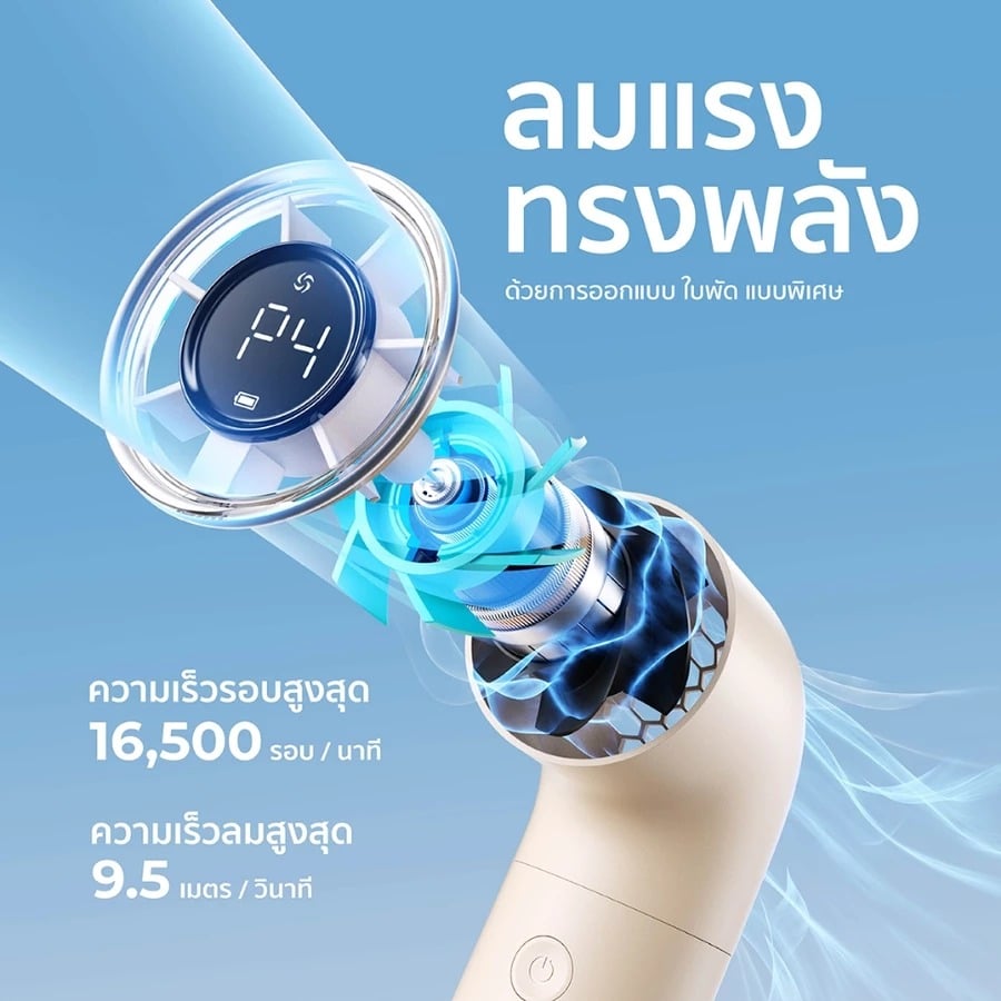 - มอเตอร์ Turbine Brushless ความเร็วสูง 15,000 รอบต่อนาที ส่งลมแรงสูงสุด 8.9 m/s