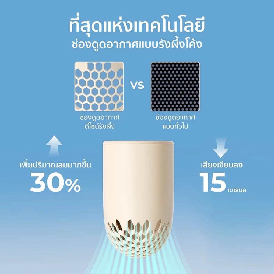 - ดีไซน์รังผึ้ง เพิ่มการไหลเวียนอากาศ ให้ลมแรงและสม่ำเสมอ