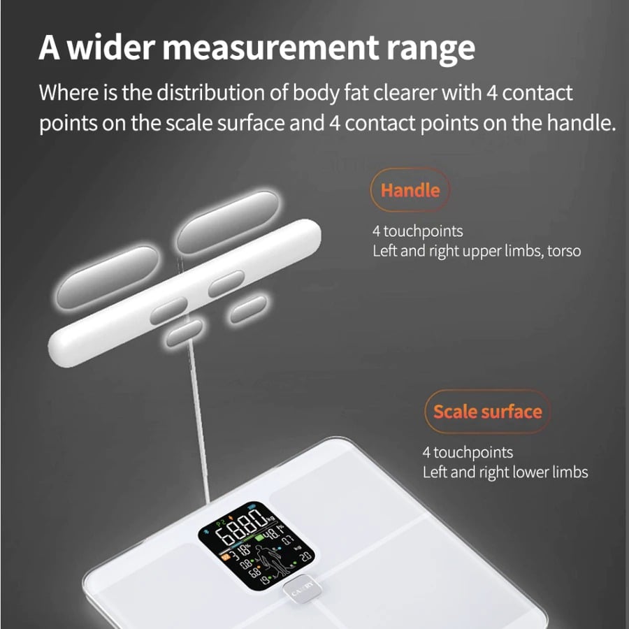 ▪ ขั้วไฟฟ้า 8 ขั้ว (4 ในมาตราส่วน + 4 ที่จับ) ให้ข้อมูลไขมัน / กล้ามเนื้อโดยละเอียดสำหรับ 5 ส่วน